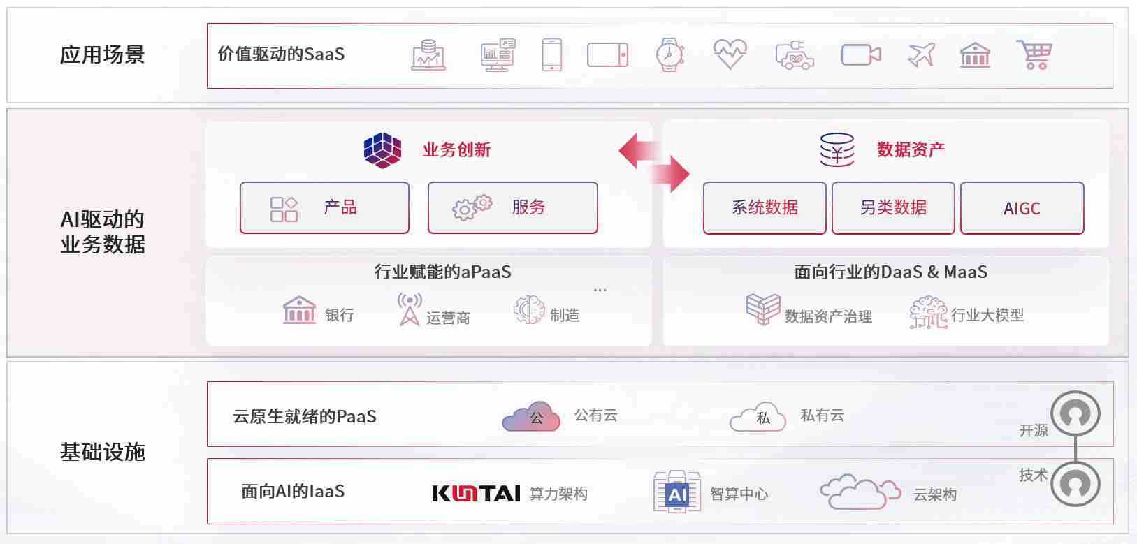 数字时代,,,,围绕企业数字化转型的关键要素,,,,z6com尊龙数码开创性的提出数云融合战略和技术体系框架,,,,着力在云原生、、数字原生、、、AI原生和信创产业上架构产品和服务能力,,,为处在不同数字化转型阶段的快消零售、、、汽车、、金融、、医疗、、、政企、、、、教育、、、、运营商等行业客户提供泛在的敏捷IT能力和融合的数据驱动能力,,,构建跨界融合创新的数字业务场景和新业务模式,,,,助力企业级客户建立面向未来的核心能力和竞争优势,,,,全面推动社会的数字化、、、智能化转型升级。。